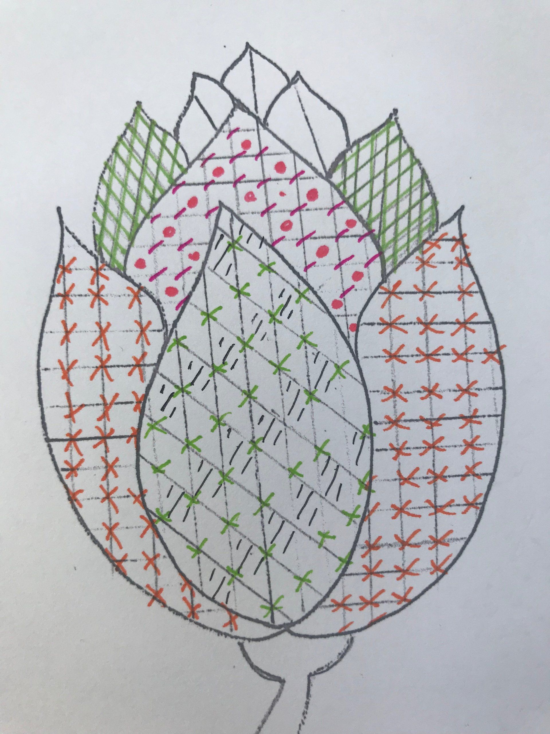 Make sure the wire is securely fastened where it overlaps. Now using three strands of the dmc thread in the lighter colour fill the shape in, start at the top using long and short stitches. It can be useful to draw directional lines towards the growing point at the bottom of the petal.