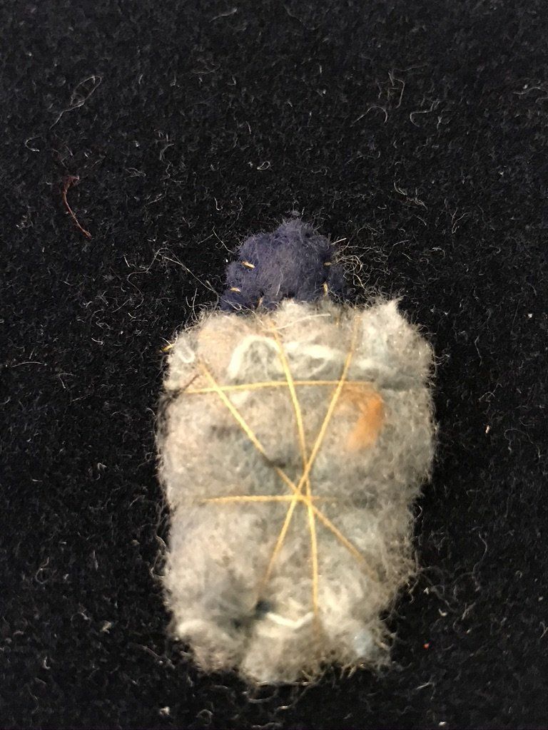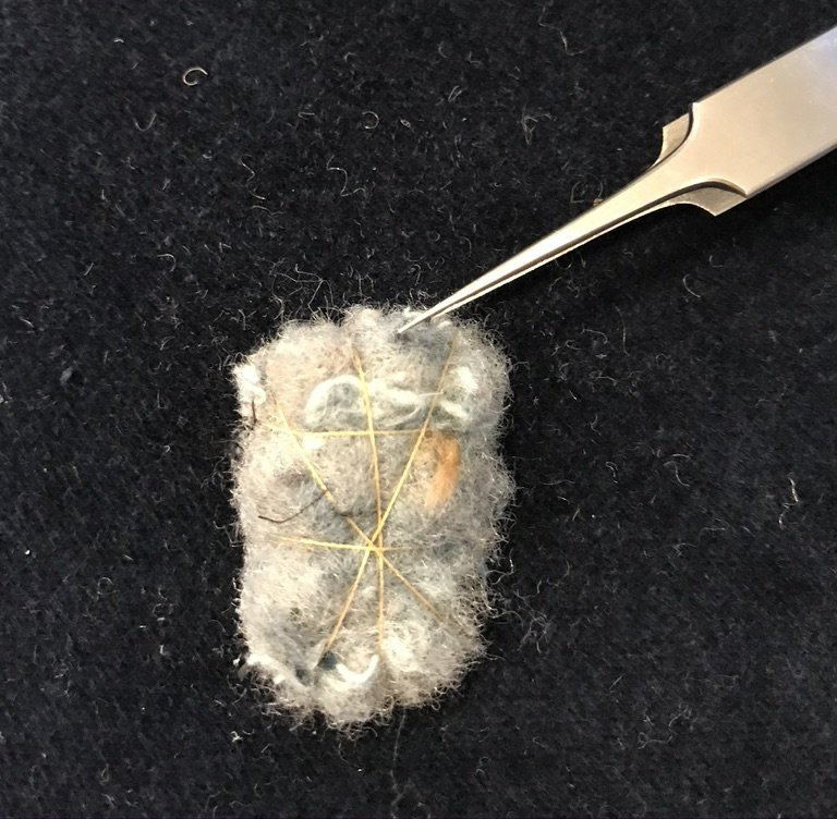 Create the body by using some carpet padding.I actually used some padding that was wrapped around some food that was delivered to my house. You never know where you might find something to use for your embroidery. the padding needs to be the length of the wing. The shape needs to be square on top, with rounded top corners. Narrow the shape towards the bottom and create a round shape as shown.. Use a dressmaking cotton and use straight lines across the piece to hold it in place. Start with a central vertical and horizontal line first.