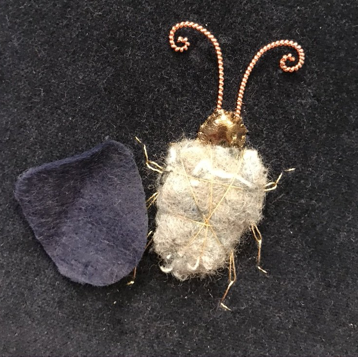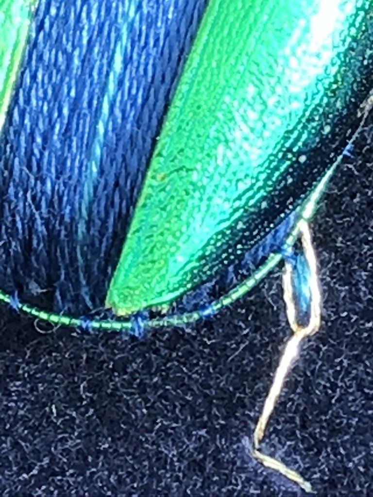 I also couched a green/blue twist around the body of the beetle and stitched a contrast thread down the middle of the body of the beetle.