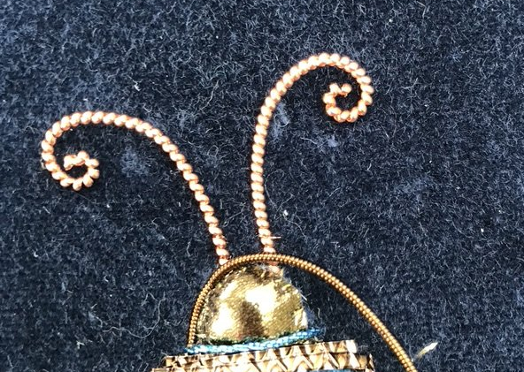 Add pearl purl antennae and you can couch these down just at the bottom, just tucking them under the felt for the head. I used a number 3 from golden antennae here. Then cut out a piece of leather or kid to stitch over the felt that has been laid for the head.