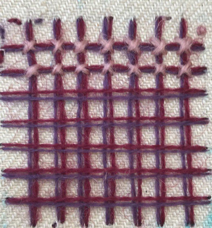 The motif finished using a tent stich to hold the trellis work down and then a french knot in every alternate square.