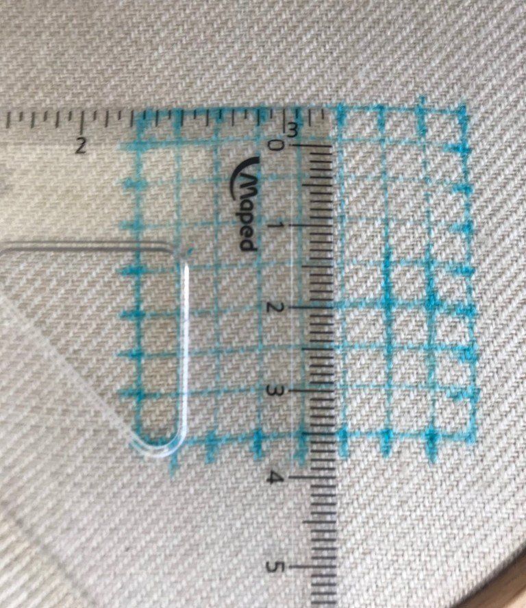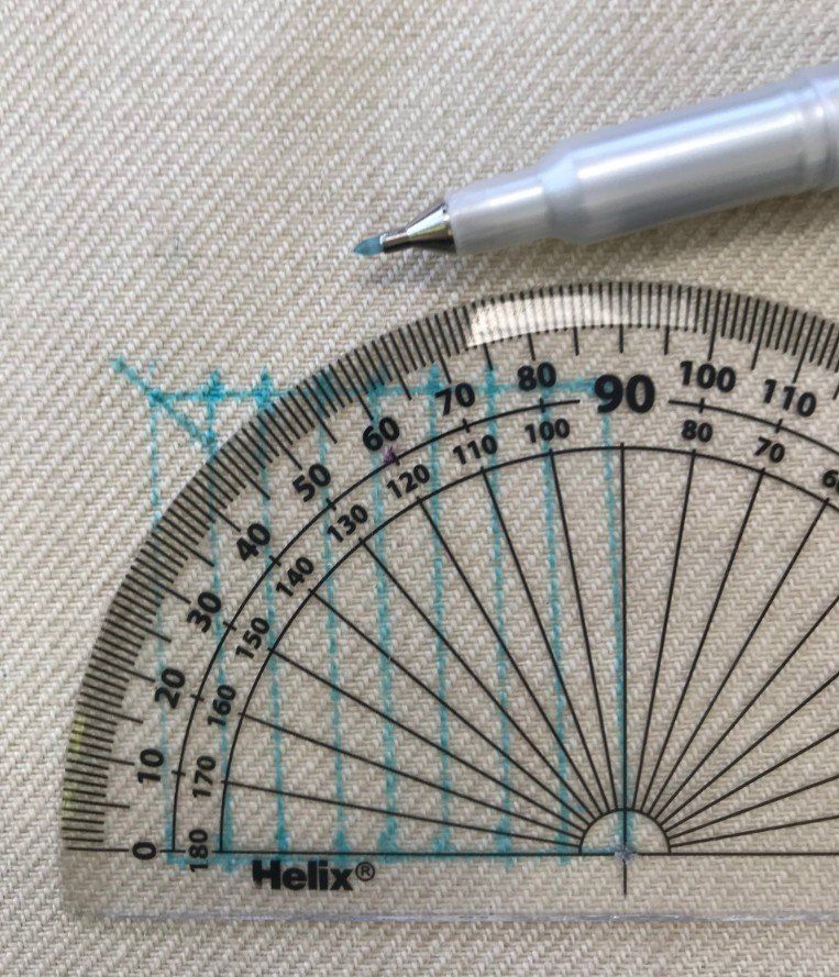 Mark a 4cm square onto linen twill. Use a washable pen. Mark 5mm gaps around the edges.