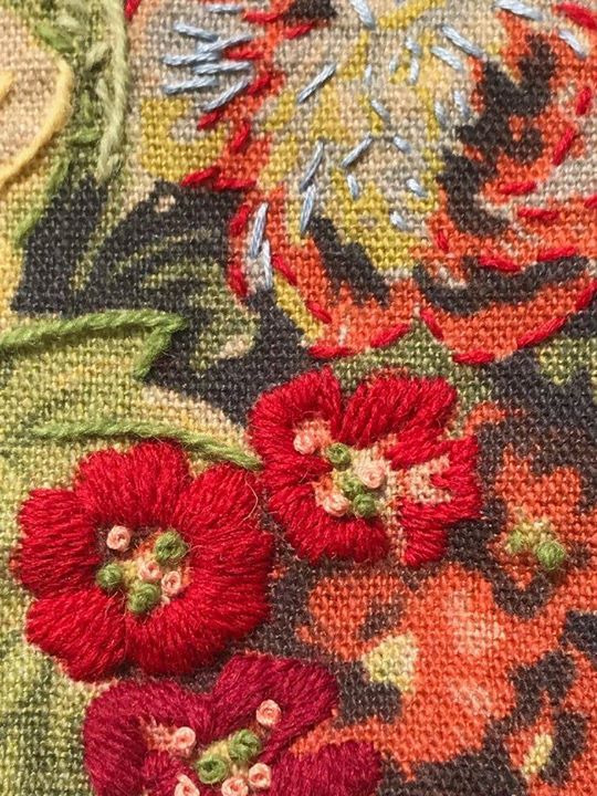 A fell in love with an antique piece of cloth in a craft fair and had it printed onto linen. I knew immediately it would make a great piece to embroider. Its wonderful to see a flat print come alive with embroidery stitches. You can feel free to embroider as little or as much as you like. Its great to use stitches like stem, chain and running to outline and then satin to fill in. Feather stitch to create flow with fly stitch to add texture and not forgetting everyone's favourite french knots.
