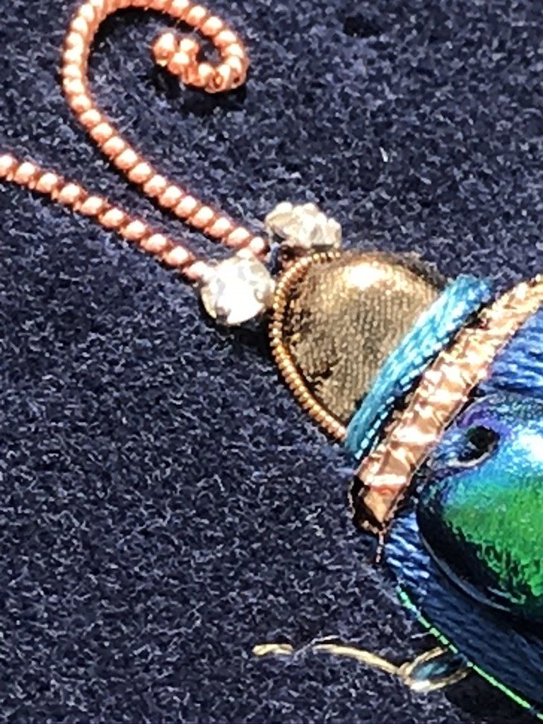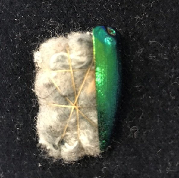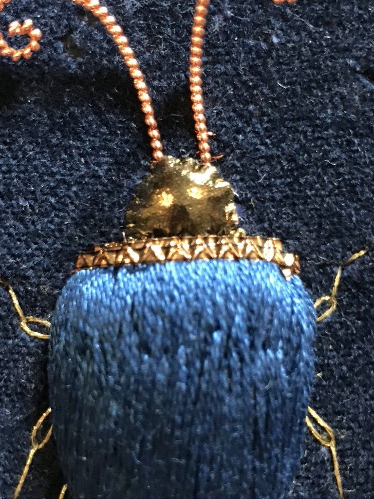 I also couched a green/blue twist around the body of the beetle and stitched a contrast thread down the middle of the body of the beetle.
