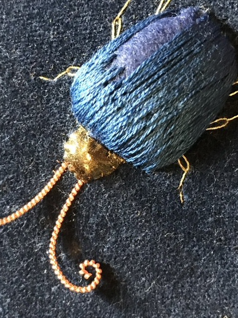 Add a piece of blue twist across the bottom of the head. Couch a piece of pearl purl around the head. I used number 1 from Golden Hinde.