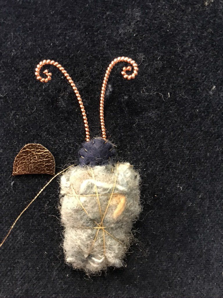 Add pearl purl antennae and you can couch these down just at the bottom, just tucking them under the felt for the head. I used a number 3 from golden antennae here. Then cut out a piece of leather or kid to stitch over the felt that has been laid for the head.