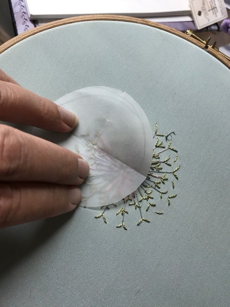 Add some seeding and small straight stitches to create the seed heads. Embroider these at angels and use a perle thread, either no five or eight. Use your tracing paper template to make sure you maintain a good shape.