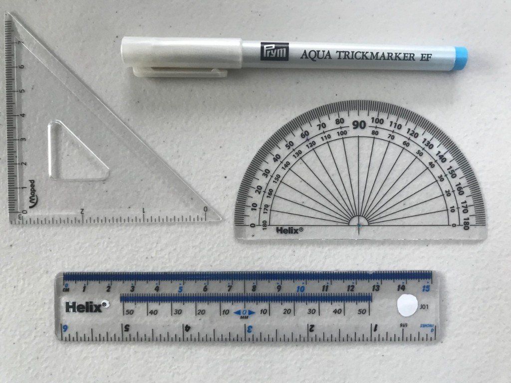 Any good quality embroidery fabric would be good. I used a linen twill in the samples shown here and 2ply Appleton wool. Apart from the obvious like a good crewel needle it would make life a little easier if you have a plastic see through ruler, protractor and set square. Also a water slouble pen and paintbrush.