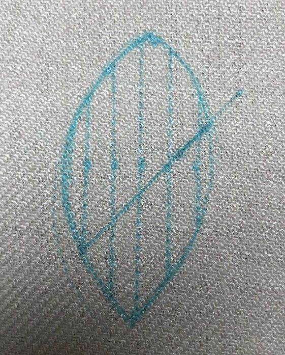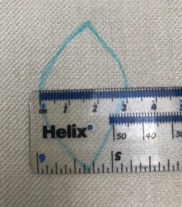 You need to draw the longest directional lines in first and I generally draw then down the length of the shape. If you want to experiment then photocopy the shape onto some paper and draw different angled starting lines and see what you can achieve. Start like you did the trellis filling stitch. Measure the width and divide by a number as equally as you can. So the above shape is 30mm. Divide by 5mm and we have 6 starter lines. Remember the last line will fall on the outer edge so you will not need to draw it in.