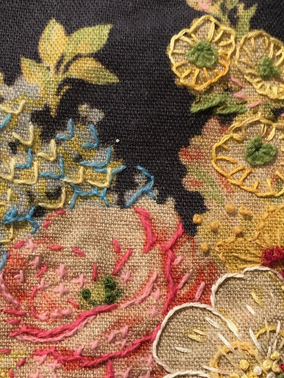 A fell in love with an antique piece of cloth in a craft fair and had it printed onto linen. I knew immediately it would make a great piece to embroider. Its wonderful to see a flat print come alive with embroidery stitches. You can feel free to embroider as little or as much as you like. Its great to use stitches like stem, chain and running to outline and then satin to fill in. Feather stitch to create flow with fly stitch to add texture and not forgetting everyone's favourite french knots.